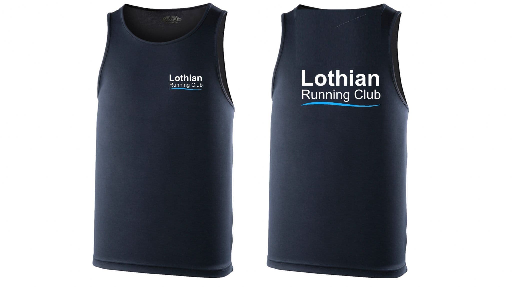 French Navy dryfit vest with the Lothian running club logo (white with blue line) small on the front and large on the back